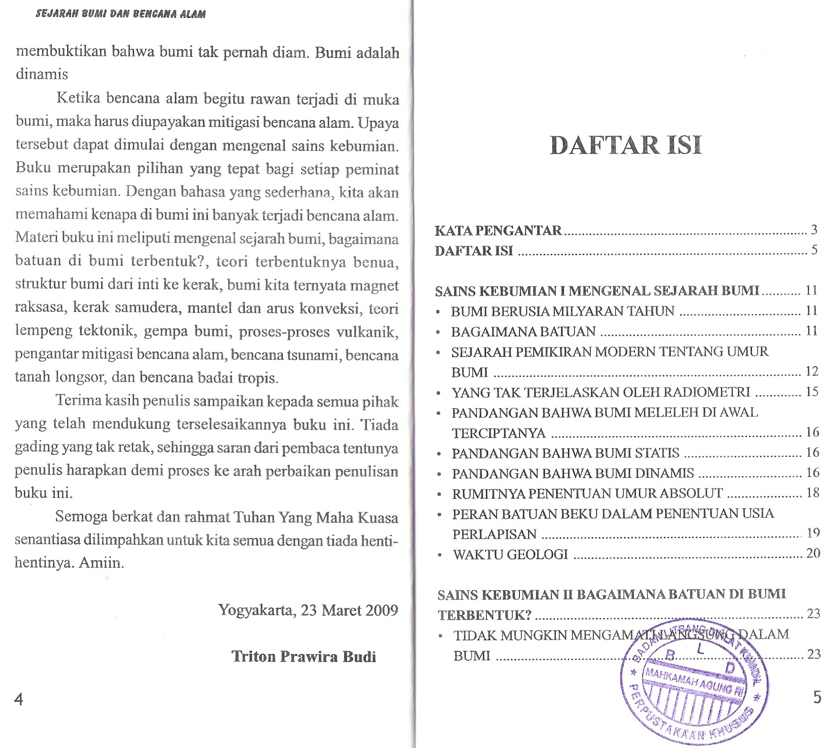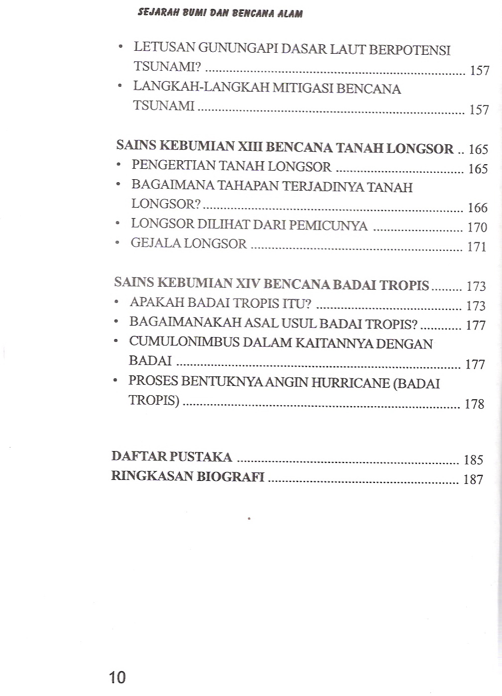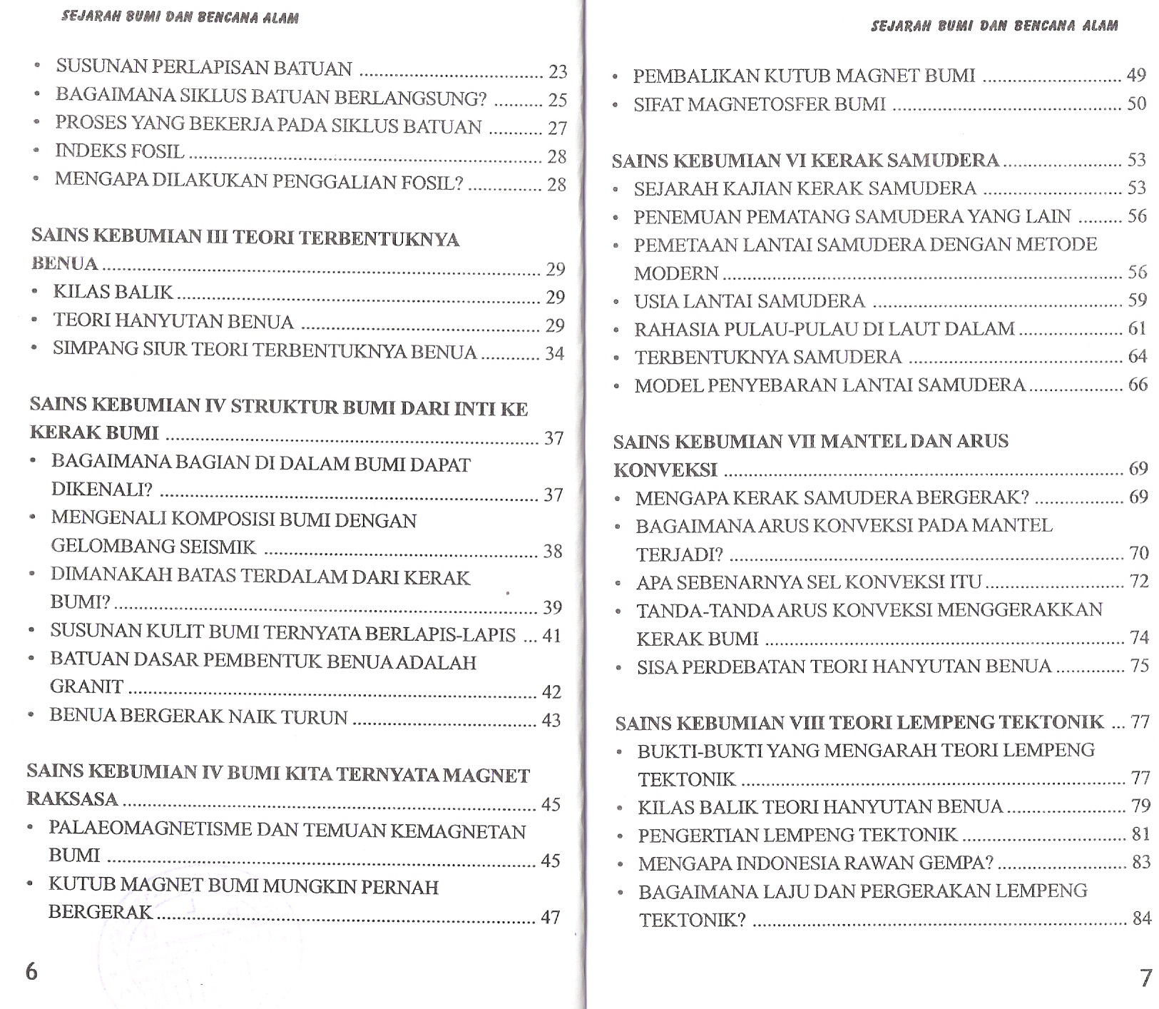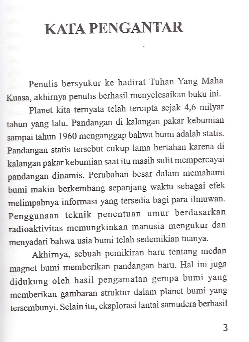 sejarah Terbentuknya bumi, batuan, benua, struktur bum, kerak samudera, mantel dan arus konveksi, lempeng tektonik, gempa bumi, proses vulkanik, tsunami, badai tropis, dan mitigasi bencana alam.
