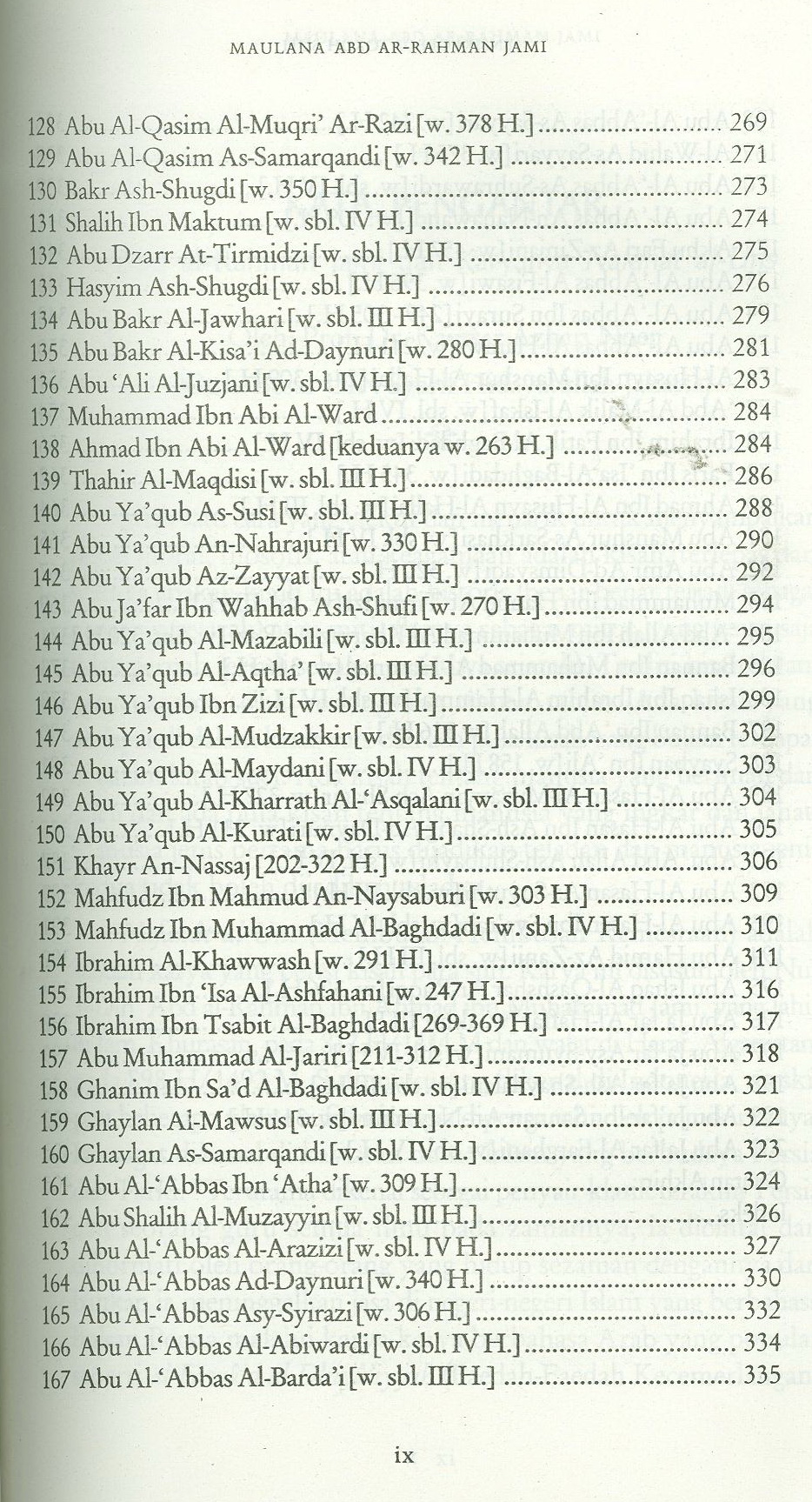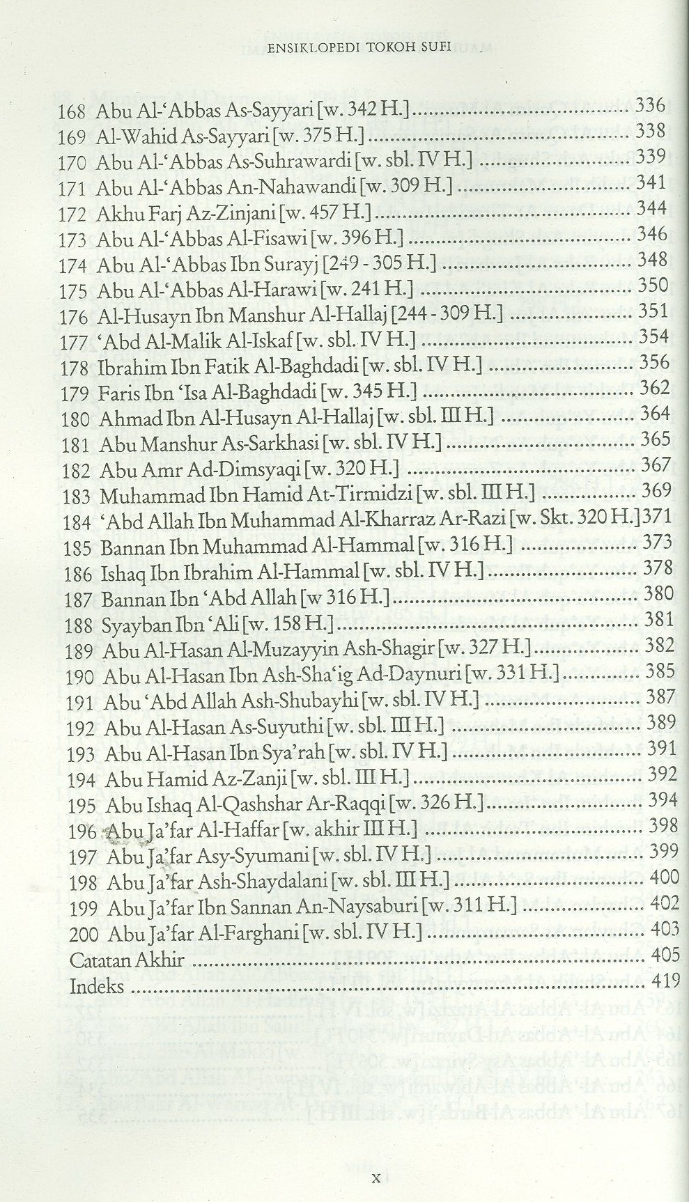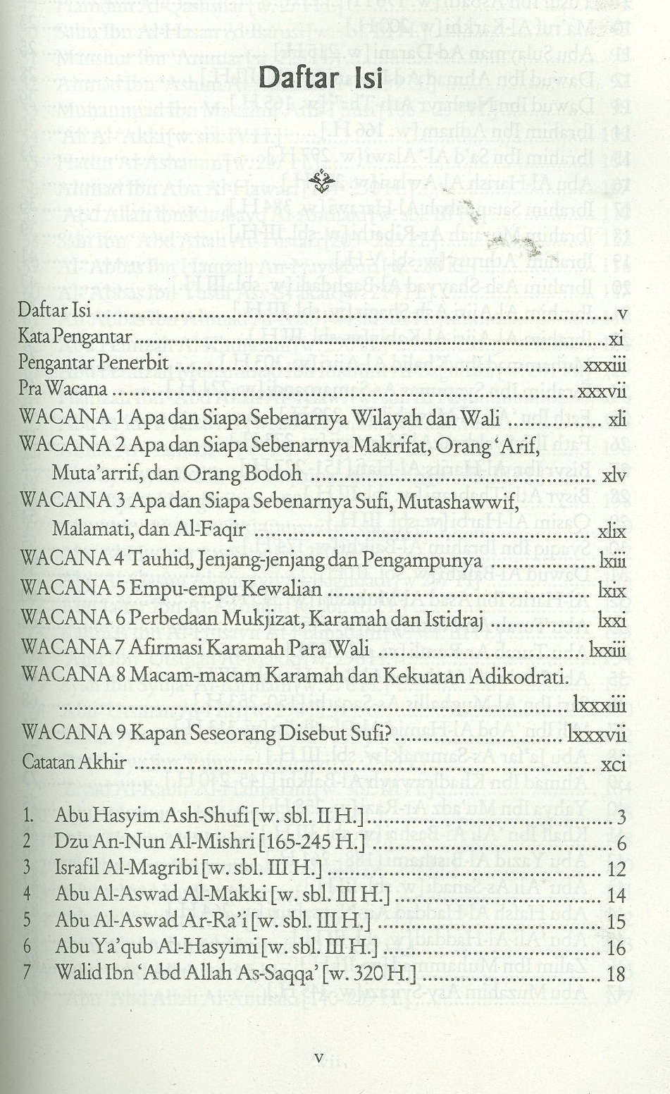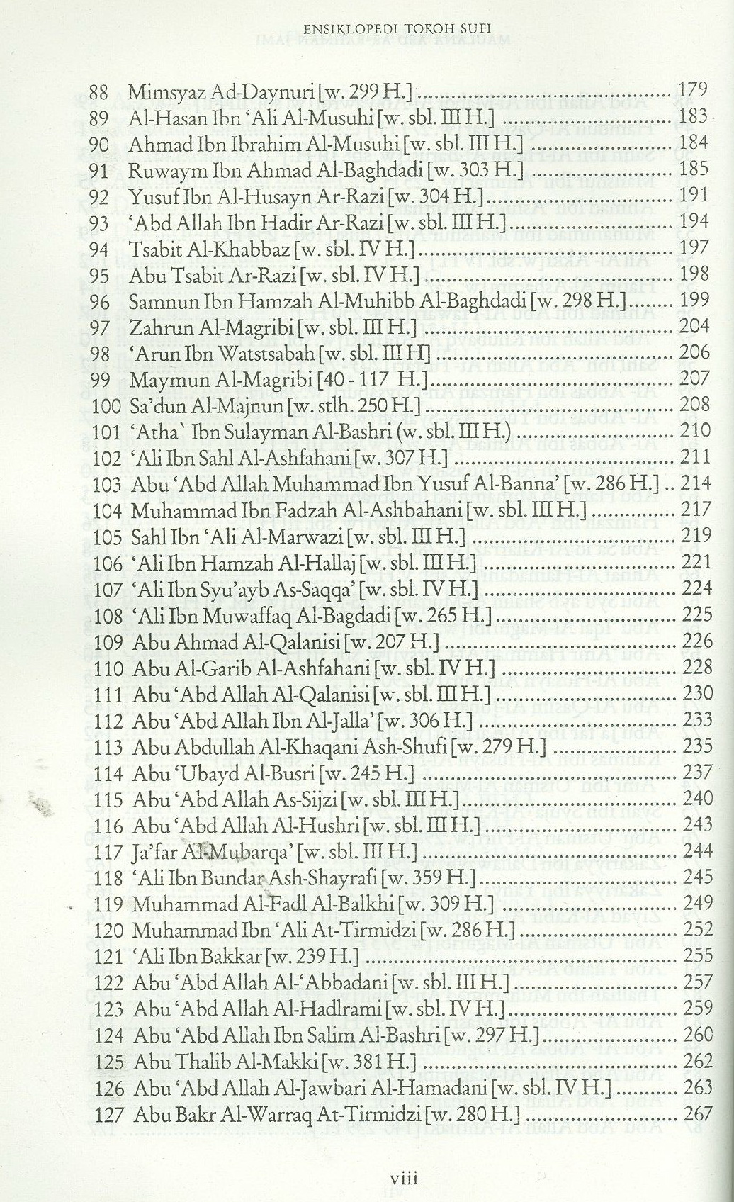 Penjelasan mengenai doktrin-doktrin penting dalam dunia tasawuf, memuat biografi 200 syekh sufi terkemuka selama kurun abad III H.
