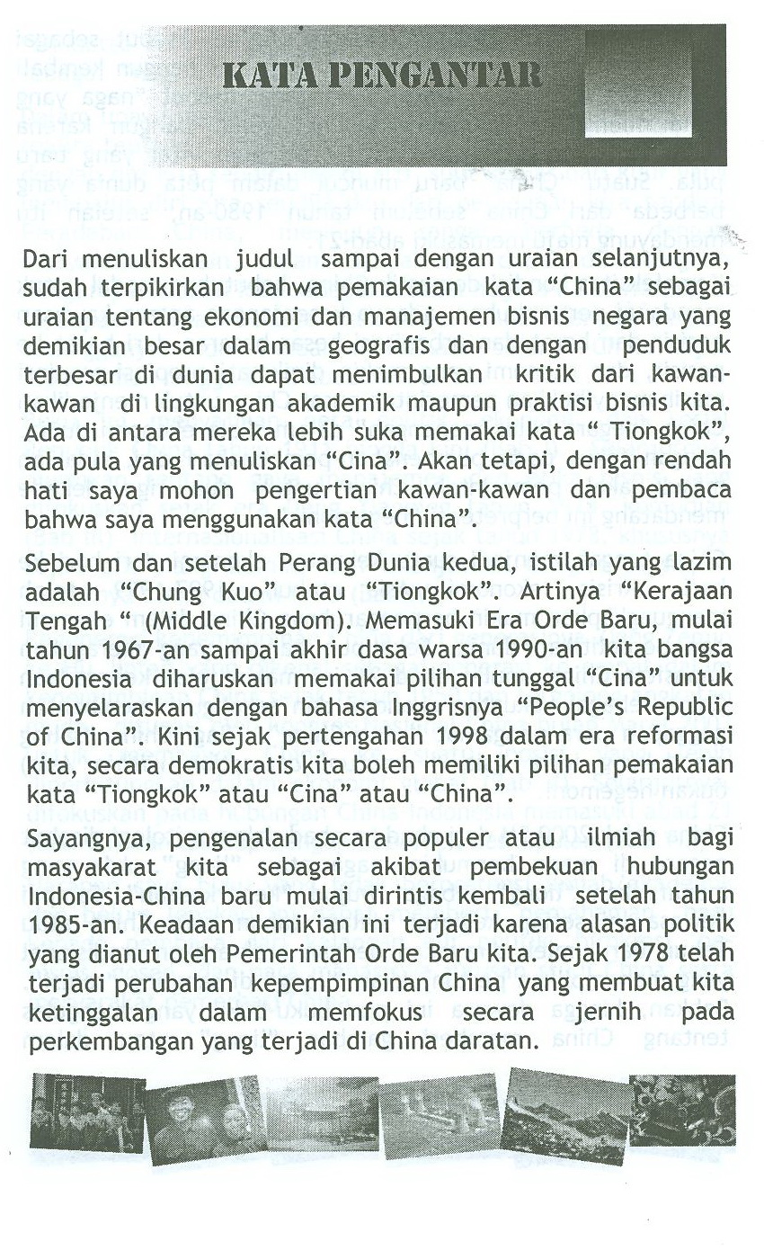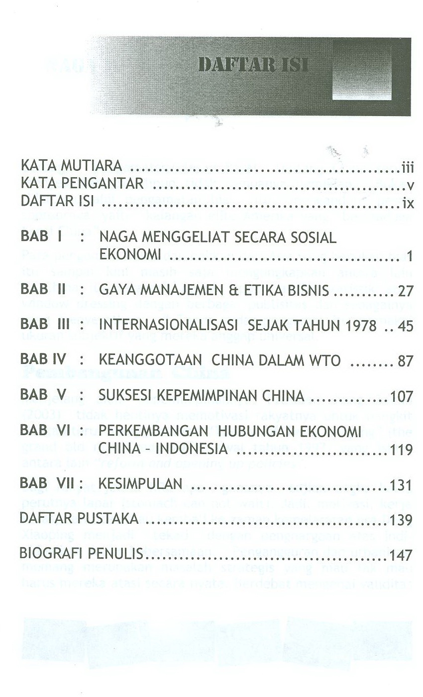 Pokok bahasan buku ini tentang peta politik ekonomi dan sosial,gaya manajemen dan etika bisnis,Internasionalisasi sejak 1978, keanggotaan dalam WTO, suksesi kepemimpinan generasi ke-4, dan perkembangan hubungan ekonomi Cina-Indonesia