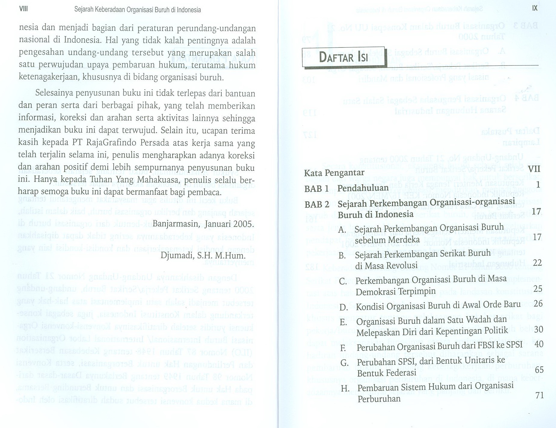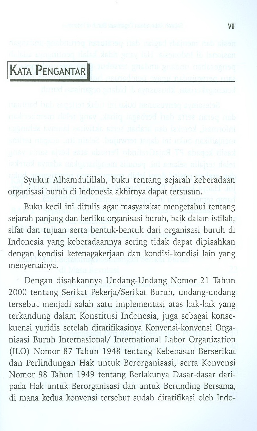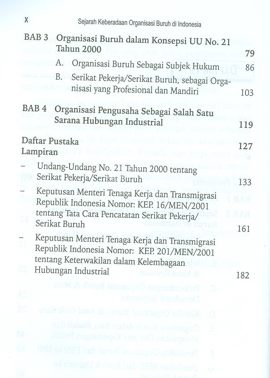 Buku ini menguraikan sejarah perkembangan organisasi buruh Indonesia yang di mulai sebelum Indonesia merdeka hingga pembaharuan sistem hukum pada Organisasi buruh