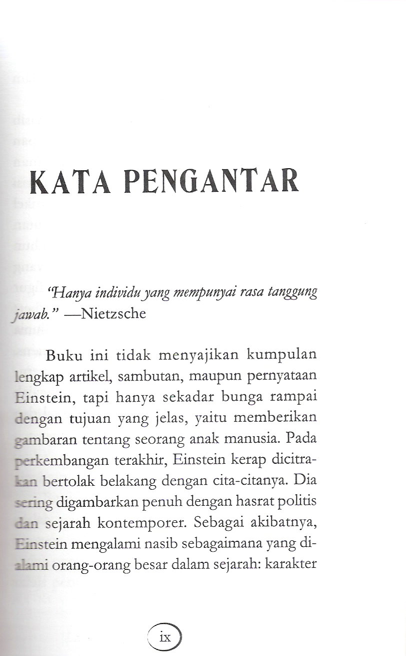 Berisi kumpulan-kumpulan artikel kesaksian dan kata-kata bijak einstein dalam berbagai kesempatan. BUku ini mengajak anda memahami pandangan dan gagasan sang ilmuan secara utuh tentang dunia, kehidupan, kemanusiaan, dan berbagai persoalannya.