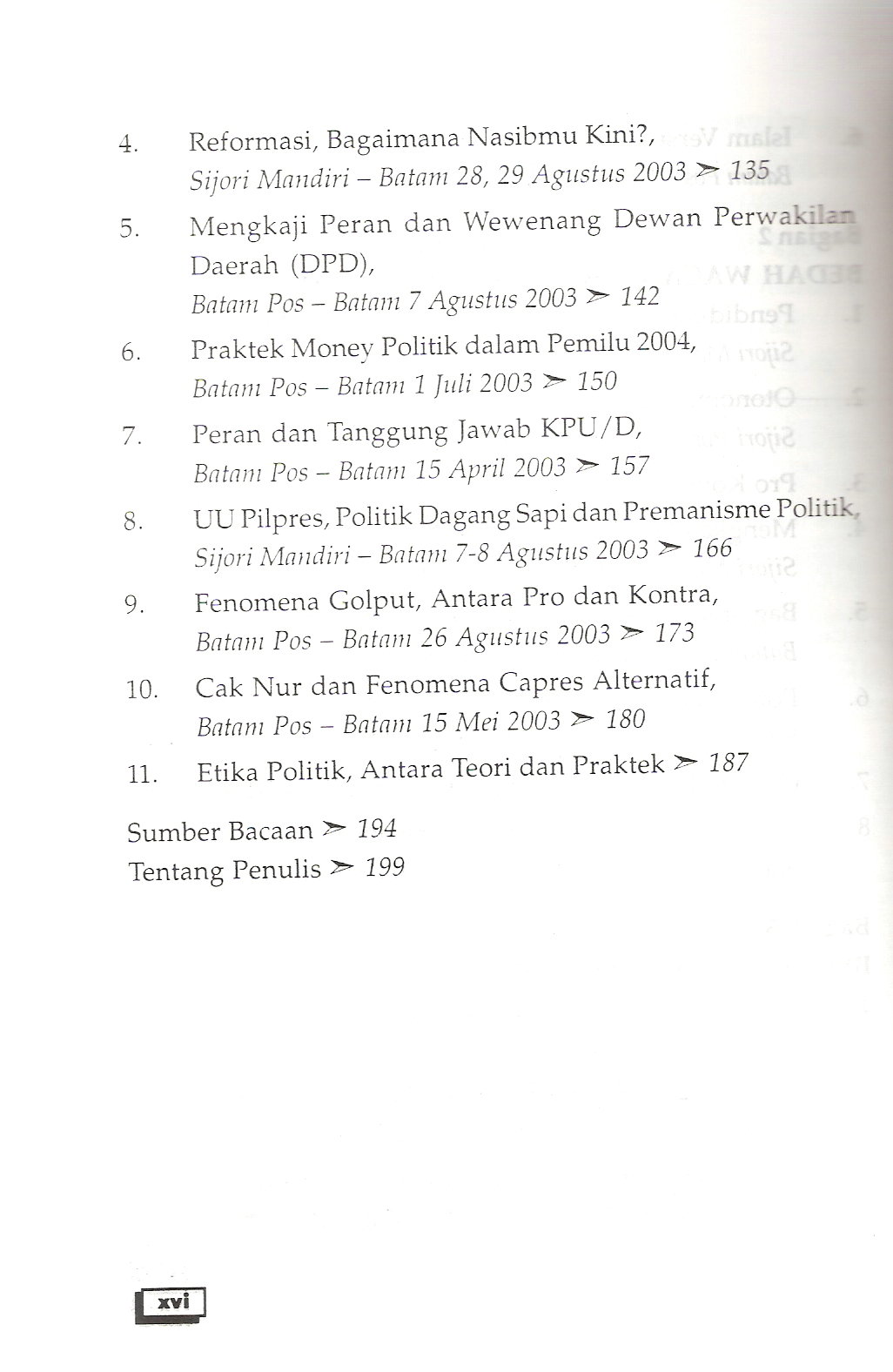 Berisi kumpulan tulisan di beberapa koran di batam yang merupakan upaya merespon di fenomena yang terjadi dari perspektif kehiudpan keagamaan, sosial kemasyarakatan dan masyarakat.
