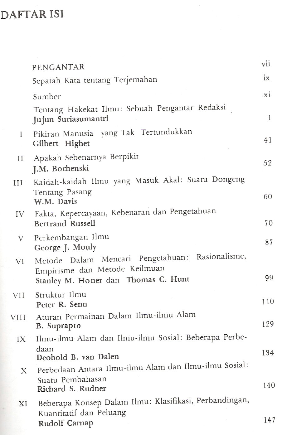 Berisi kumpulankarangan antara lain mencakup peranan berpikir dalam peradaban manusia, hakekat ilmu, kegunaan teori keilmuan, juga dibahas peranan beberapa disiplin keilmuan seperti : metematika, logika, statistik, bahasa dan juga peranan penelitian.