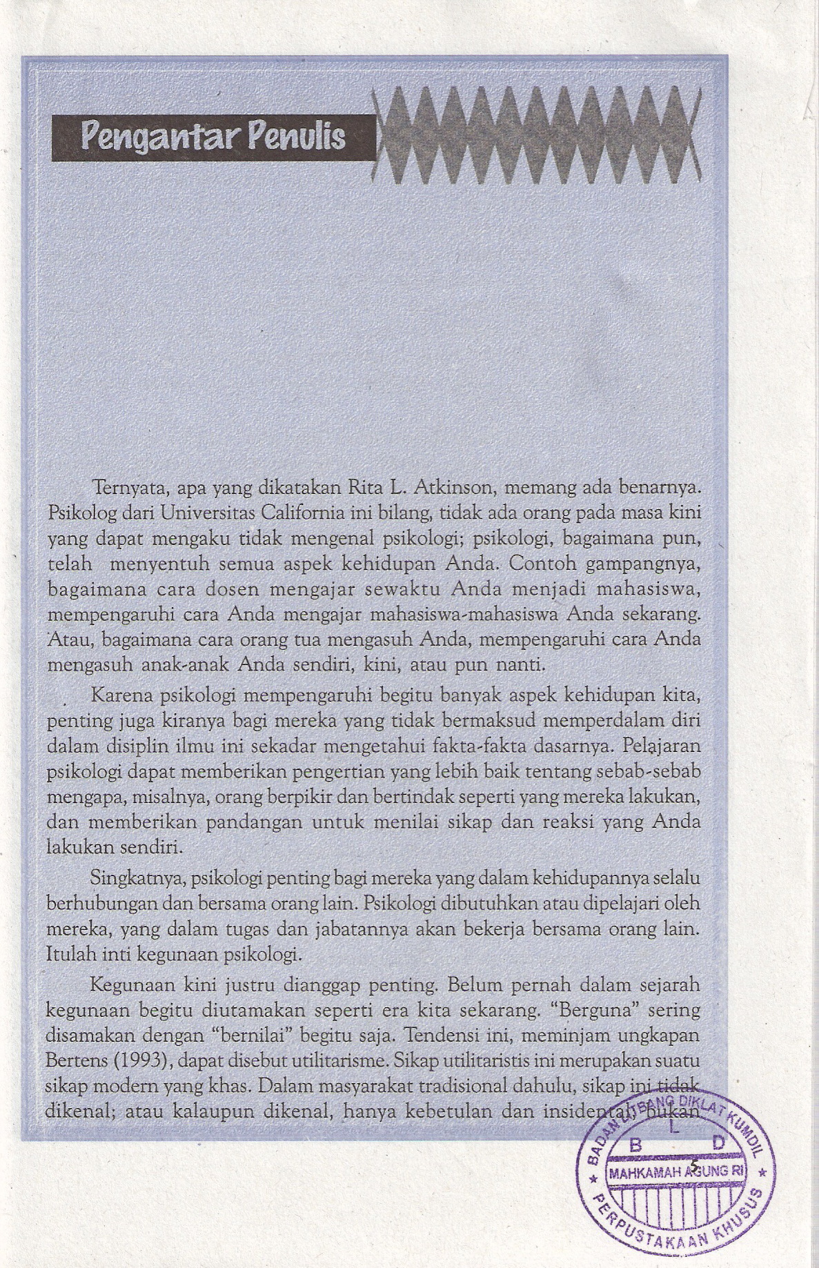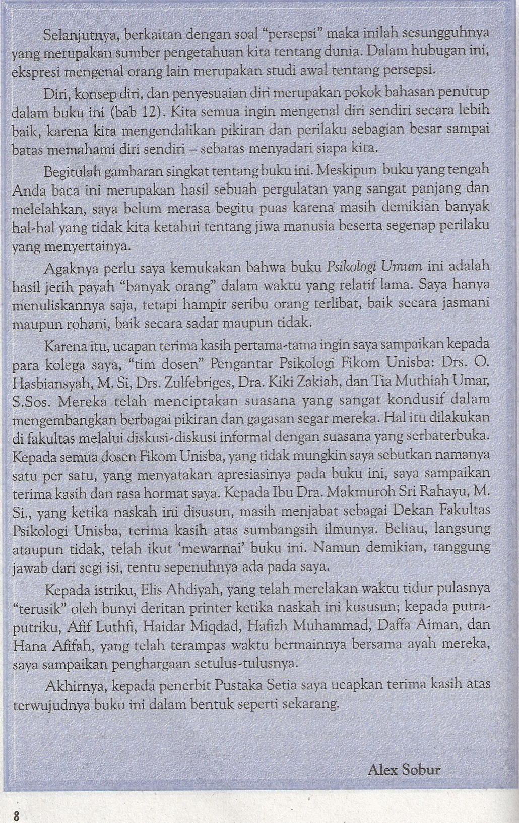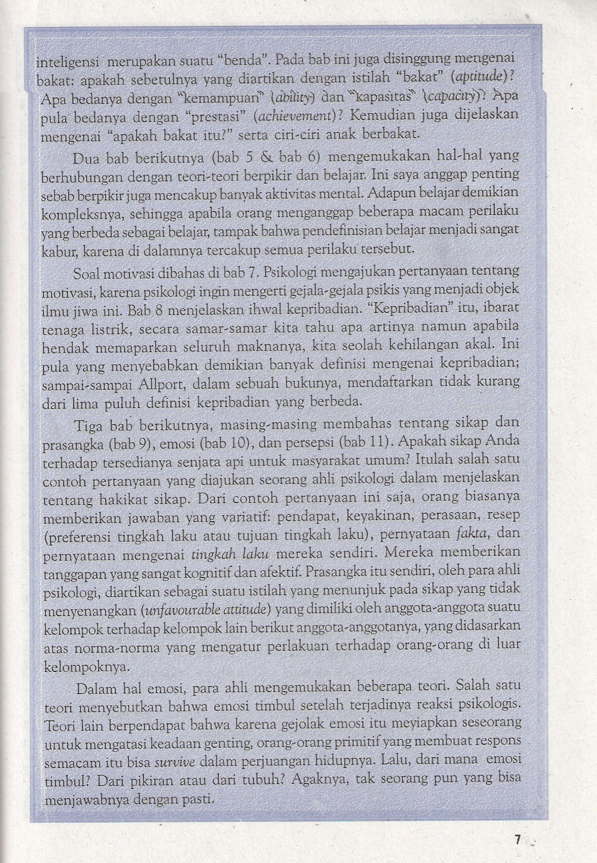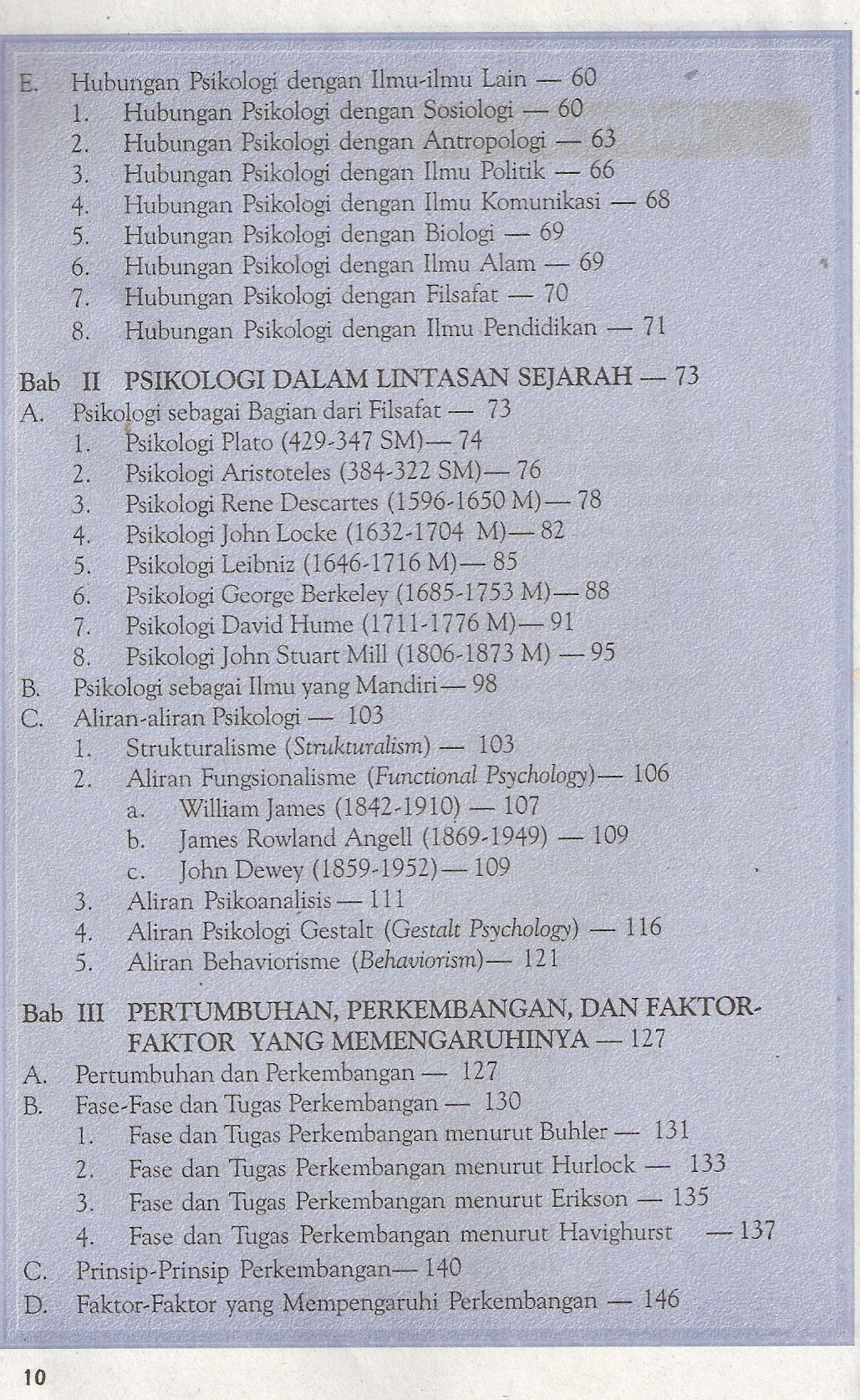 Memaparkan psikologi secara umum, namun membahas dan memperkenalkan apa itu psikologi, sejarah perkembangan psikologi dan memaparkan pertumbuhan dan perkembangan psikologi